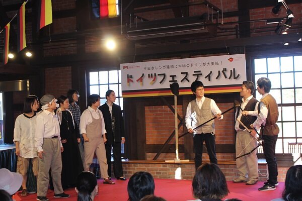 2019年10月13日(日)、半田市の〈ドイツフェスティバル・半田赤レンガ2019〉にて、南山大学でドイツ語を学ぶ在学生・OB有志がドイツ語劇『ヴィルヘルム・テル』(F・シラー)の一幕を披露しました。ドイツ学科伝統の語劇は、文学作品の原文そのままで演じられます。満席の会場で、多くの方に生き生きとしたドイツ語の響きと演技を楽しんでいただきました。その後、同じステージでドイツ学科によるシラーの「喜びの歌」(第九)朗読コンクールが行われ、大人から子どもまで約20人の参加者が、ドイツ語による朗読や歌に挑戦しました。