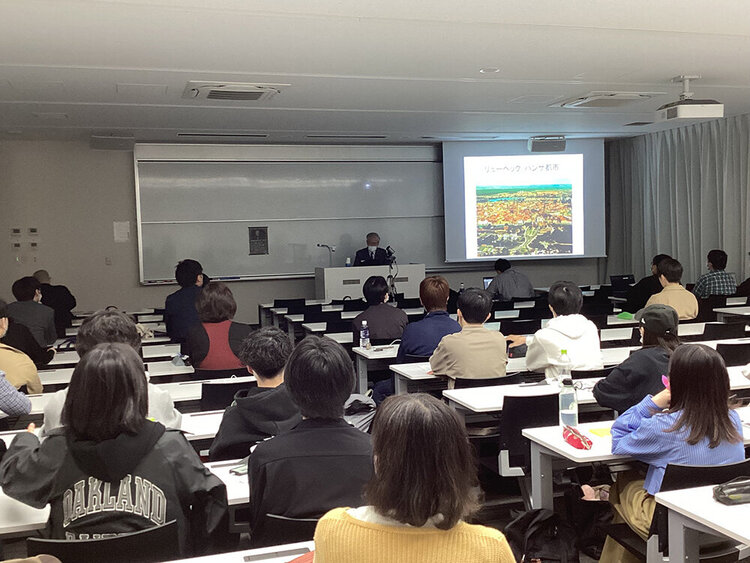 講演では、まずドイツの各地方の風景や街並みを紹介して学生をはじめとする聴講者の興味を喚起していただきました。そして、ランケが生まれた19世紀初頭のナポレオン戦争期前後のドイツの情勢を踏まえつつ、ランケの経歴や業績、そしてランケが「近代歴史学の父」と呼ばれる所以である史料(ドイツ語でQuelle、「泉」という意味もあります)や歴史学に対する学問的姿勢を解説いただきました。