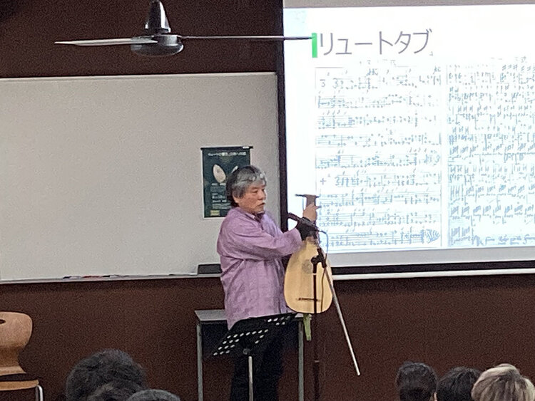 講演は2つの部分から成り、前半ではリュートの特性と、この楽器が活躍した西洋音楽史の文脈について、実演を交えてお話していただきました。後半では、中川氏がいかにしてリュートに出会い、その専門性を深めていったのかが語られました。