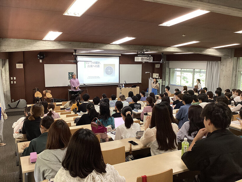 多くの学生にとってリュートは初めて目にする楽器だったようですが、たおやかで高雅な響きに魅了された人が多かったようです。また、世界的にも古楽の復興がようやく緒に就いたばかりであった1970年代に本学の学生であった中川氏が積極的に資料や情報を求めて活動をしていたということ、その後も情熱を絶やさず古楽の探究を続けていったということは、講演を聞いた学生たちにも大きな刺激となったようです。大変な集中力をもって講演と演奏に耳を傾ける約100名の聴衆に恵まれ、とても充実したイベントになりました。