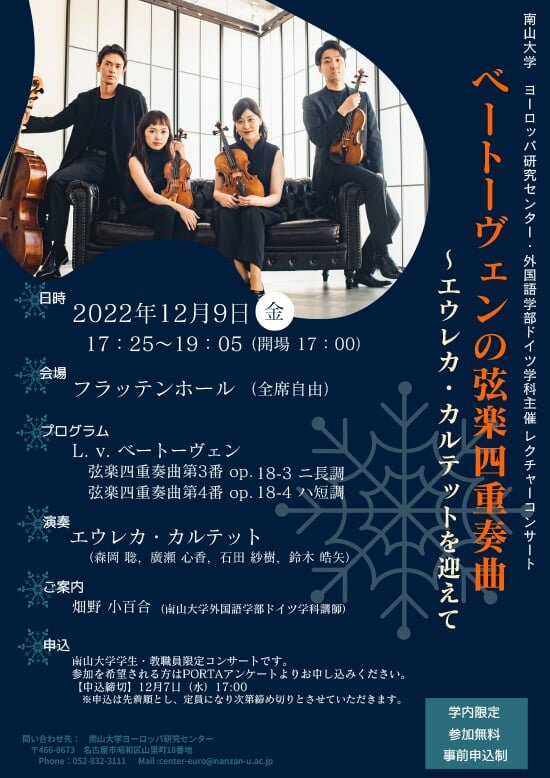 ドイツ学科、ヨーロッパ研究センター主催レクチャーコンサート「ベートーヴェンの弦楽四重奏曲〜エウレカ・カルテットを迎えて〜」