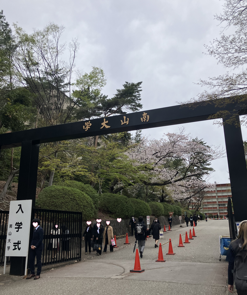 あいにくの曇空でしたが、新しいスーツ姿の新入生の顔は晴れやかです!
