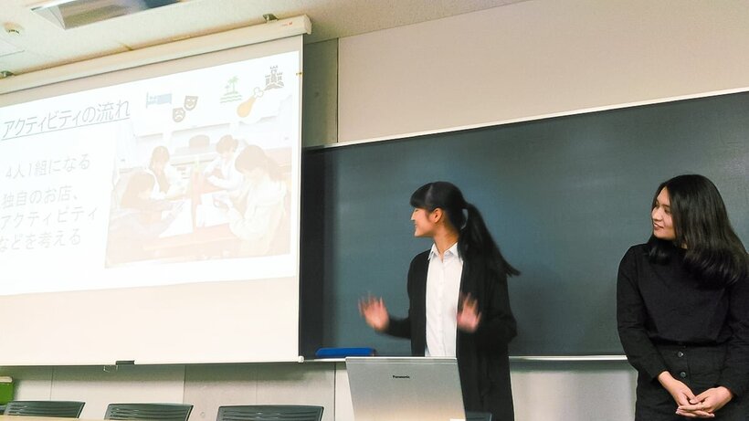 そこで、4人1組のグループを複数作り、各グループで既存のものではないサービスやアクティビティを独自に考えてスマホで広告を作成した後にクラスのチャットグループで宣伝し、予約のやり取りまで行うという学習法を提案することになりました。宣伝という行為は、商業的な場面だけでなく人に何かを薦める時やイベントを企画する時などにも言えます。また、店側と客側という間柄でチャットの文面のみで意思疎通を図るということにも重点を置きました。