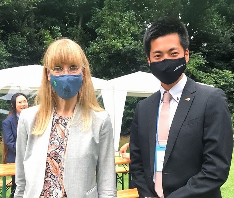 現状はドイツ語をメインで活かす仕事ではありませんが、南山大学ドイツ学科で培った国際的な視野や留学などで築いた人脈は仕事以外の場所でも大いに役立っています。私は仕事プラスαとして日独交流活動にも従事しており、名古屋日独協会の運営委員も務めております。ドイツ関連イベントの企画運営に携わるなどの活動実績を評価して頂き、ドイツ大使館主催のパーティーに招待されました。二度目に参加した際には、コロナ禍でも一度も物流ネットワークを止める事の無かったDHLの活動実績に興味を示された当時のイナ・レーペル駐日ドイツ大使のDHL施設訪問を社内調整し、実現させることができました。