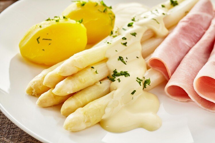 春には新鮮なアスパラガスがたくさん出回りますが、日本とは異なり、緑色だけでなく白いアスパラガスもあります。白いアスパラガスは緑色よりも少しマイルドな味がします。私の家では、白いアスパラガスを茹でて、ハムで巻き、オランデーズソースをかけて食べます。