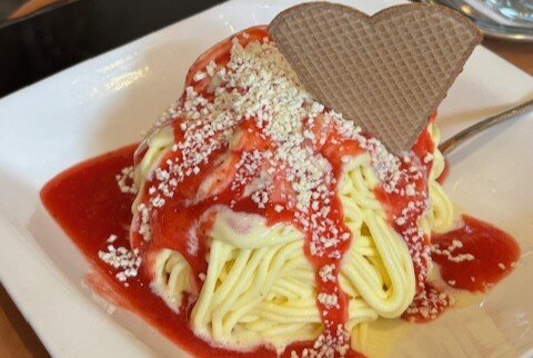 夏になると、ドイツもとても暑くなり、多くの人々が涼を求めてアイスクリーム店を訪れます。そこでは、特別なアイスクリーム、「スパゲッティアイスクリーム」を注文することができます。ホイップクリームの上に、バニラアイスクリームをスパゲッティの形にプレスで押し出します。モンブランに少し似ています。最後に、イチゴソースと削ったホワイトチョコレートがかかってます。